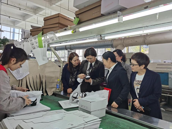 图为,何道芬在舒之恒鞋业有限公司调研女性创业就业工作。